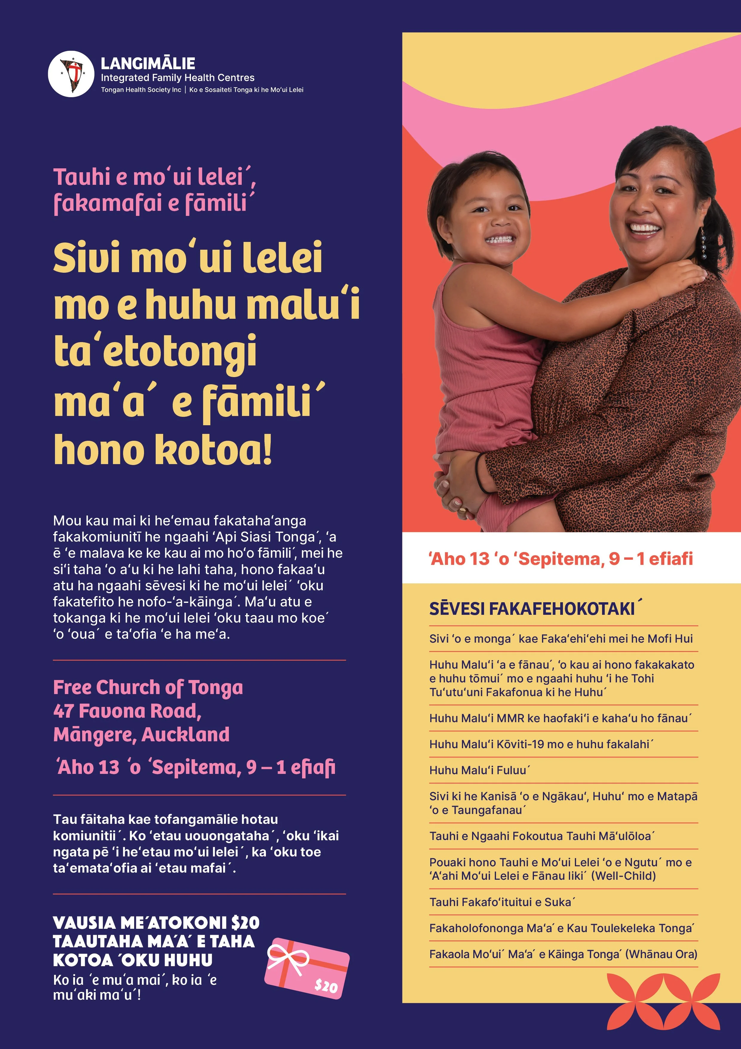 Join us at our Tongan Church community event, where you and your family, from the youngest to the oldest, can access a range of family-centred healthcare services. Receive the healthcare you deserve without barriers.